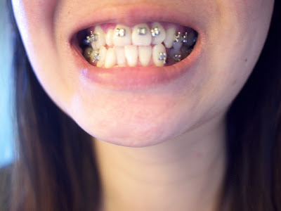 洗過牙之後,醫生先幫我上那些一顆顆的小鋼粒。上小鋼粒其實挺快的,約一個小時就弄完,當天回家一直咬到自己的嘴巴,太不習慣戴牙套的感覺了。